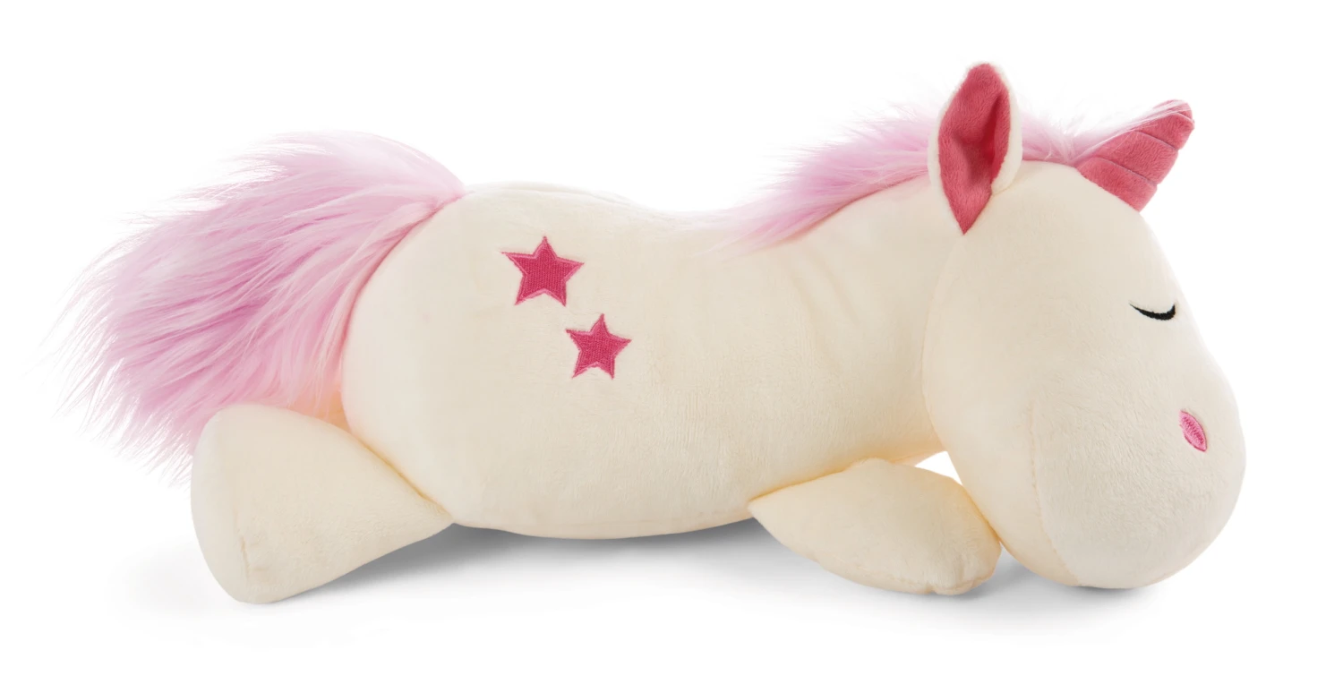 Durch die äußerst ansprechende Gestaltung mit regenbogen-funkelnder Metallic-Folienbedruckung bei gleichbleibender Flauschigkeit, laden die beiden Einhörner zum Träumen und Schmusen ein.